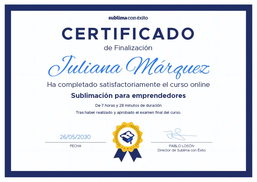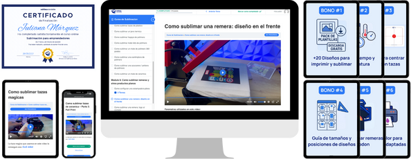 Al completar el curso y aprobar el examen online, recibirás tu Certificado de Finalización, un reconocimiento a tus conocimientos y habilidades en sublimación.